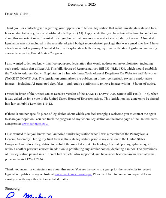 That being said, other than addressing States' rights to regulate AI, your response in no way addressed the ideas raised in my letter to you about AI which was mainly focused on rapacious data center development that is already warping the electricity marketplace and increasing cost on consumers who have already paid for the "wires" and generation development over time. The net result is lower affordability for people and subsidies for the tech-bros.