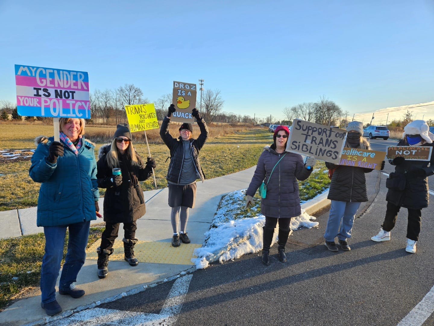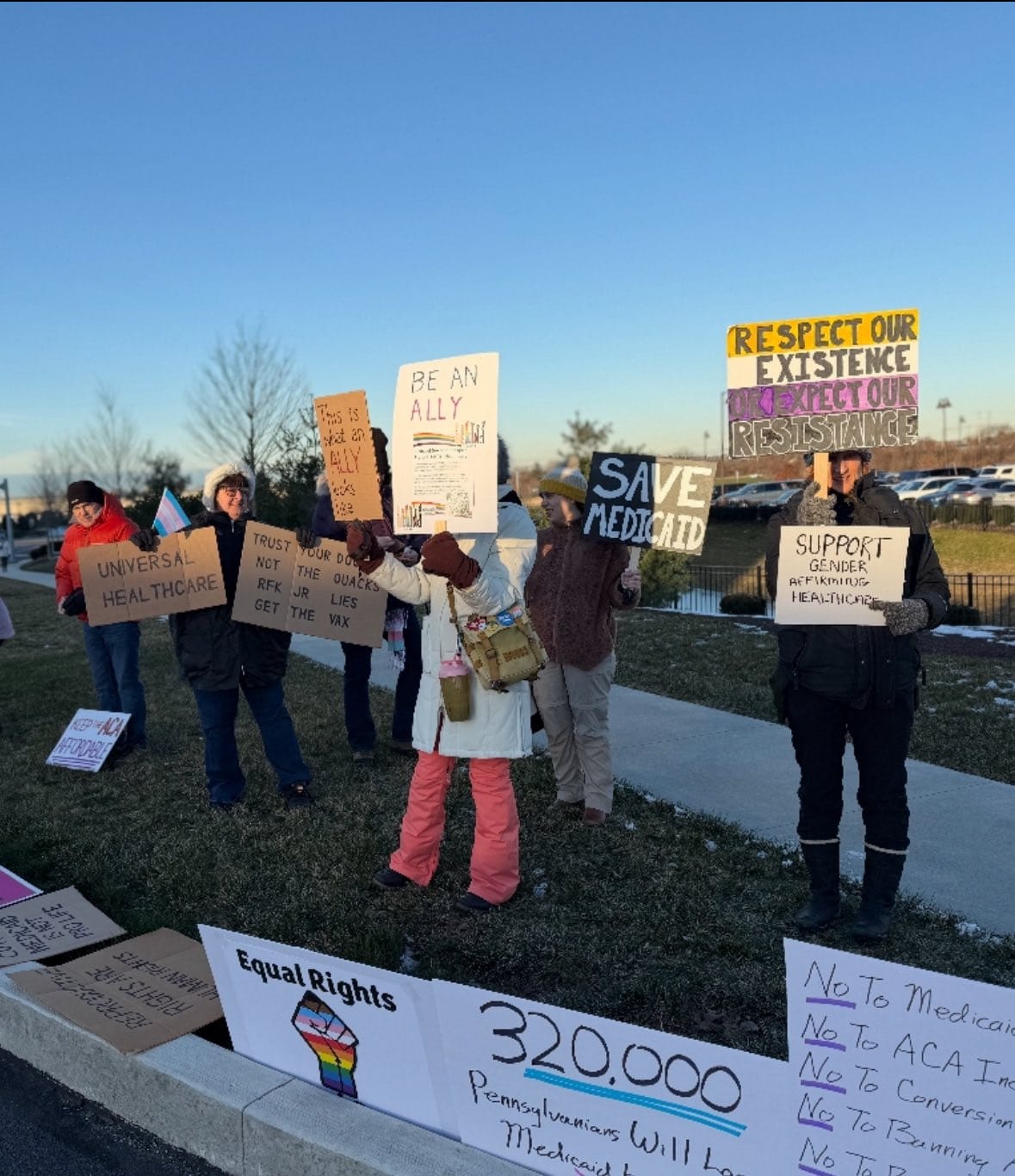 Protesters gathered on a very cold morning in the snow to oppose his policies on transgender care and healthcare cuts. Corinne Goodwin, Robin Gow, Jacob Kelly and other members of the Eastern PA Trans Equity Project spoke. Lehigh County Controller Mark Pinsley chanted with us and even sang a song! Tony Ianelli spoke to the protesters saying he supports us. Allentown Mayor Matt Tuerk attended the meeting and told us that Congressman Ryan Mackenzie and Senator Dave McCormick were there.