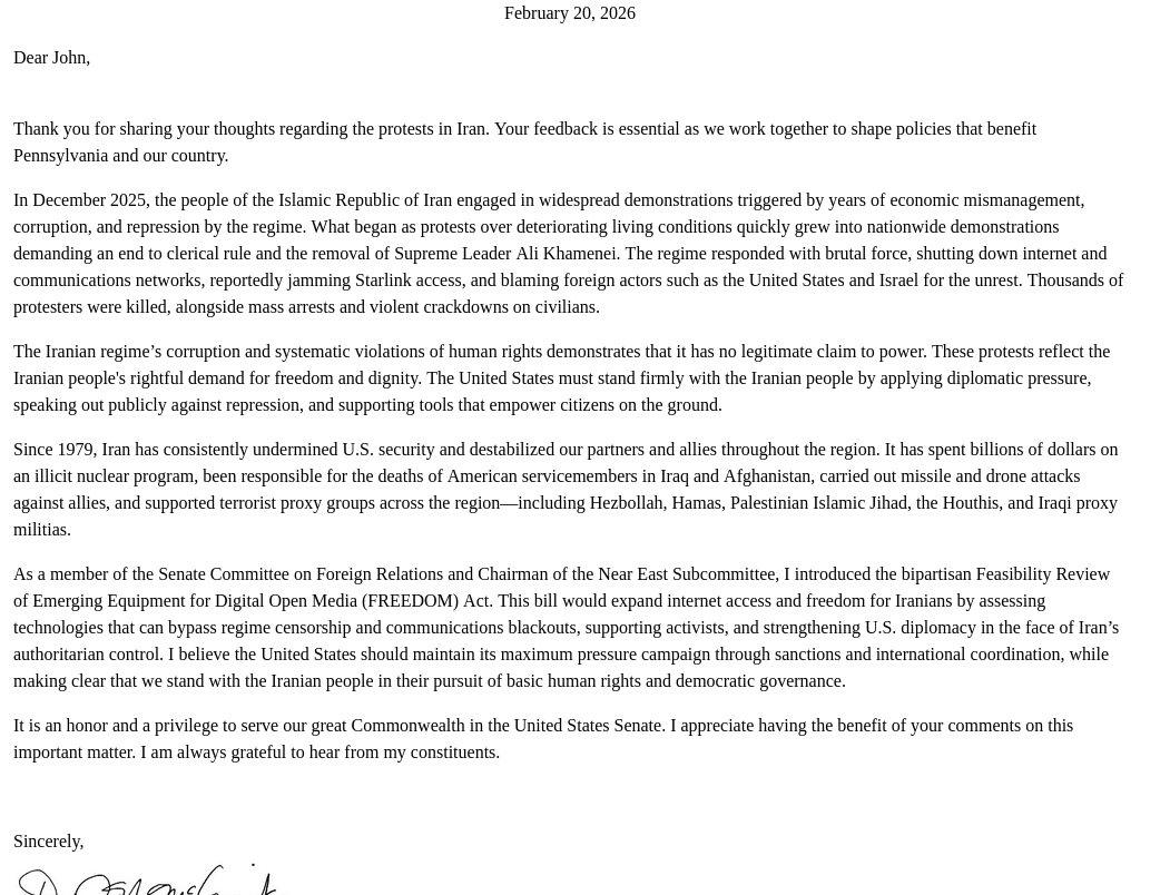 Dave McCormick's staff sent a response about Iran. When that is not a topic that has been raised.