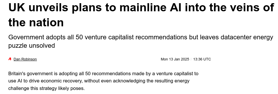 Big tech, who has little use for government unless it is writing checks, subsidizing their business, or getting out of the way, would like government to share in infrastructure costs for building and running these monster data centers. The tech lordlings promise near infinite benefits like solving all the worlds hardest problems, unlimited economic gain, new industries that politicos would be foolish to miss out on. Like the snake oil salesmen of years gone by, they are full of crap. But armed with shiny slide decks crafted by management consultants and psychologists and supported by well funded influence campaigns, they are persuading the politicos. Not to mention steak dinners, envelopes, and promises of 'private' can't go wrong investments.