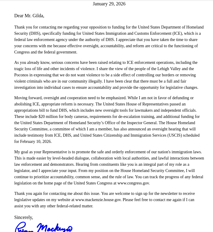 Ryan Mackenzie response below. Note that the $20MM so proudly announced for body cams is 0.17% of the DHS budget...nothing burger. Welcome the hearing in February but question why it has taken so long since violence against citizens started last summer that is more than 25% of Ryan's term.