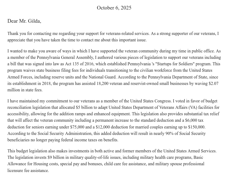 Thanks for your October 6th response about veterans. Hopefully your government shutdown doesn't affect care for our veterans.