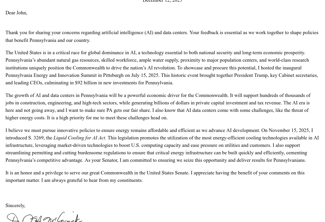 What is your interest in data center cooling with your bill S. 3269 the Liquid Cooling for AI Act? Maybe it is related to "streamlining permitting and cutting burdensome regulations on critical energy infrastructure."