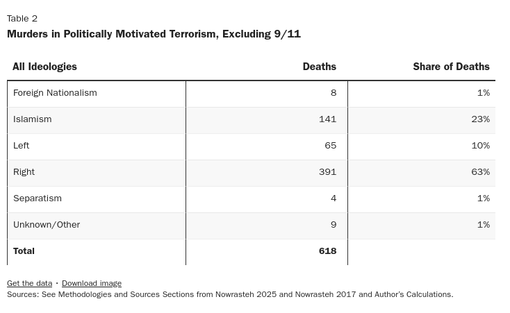 In September, the CATO Institute, a libertarian think tank, published an article that concludes that political violence remains relatively rare. Using their own methodology they counted up politically motivated terrorism in various ways. This particular table excludes 9/11. The share of deaths doesn't really matter to me but we do hear a blame game from the left and right. Any non-zero number is bad, not good.