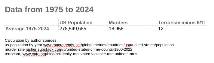 The chance of being a victim of murder or political violence is very small, which is the point of the CATO Institute article. On average, your chance of being murdered in the US, in any given year, for any reason is about 1 in 14,962 and your chance of being murdered by terrorism (politically motivated murder) is much less at about 1 in 2,3212474.